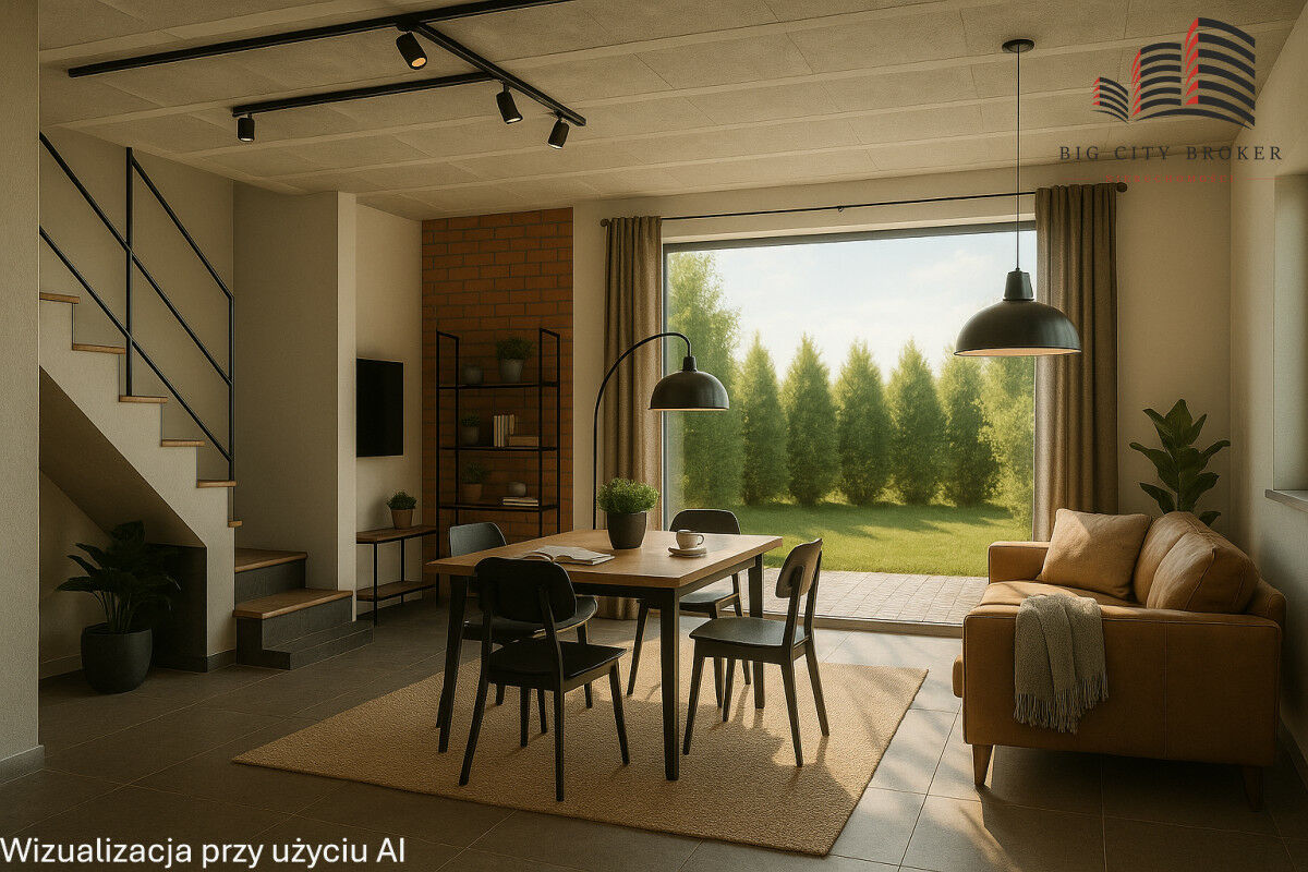 Na parterze przestronny salon z aneksem kuchennym (36 mkw).
