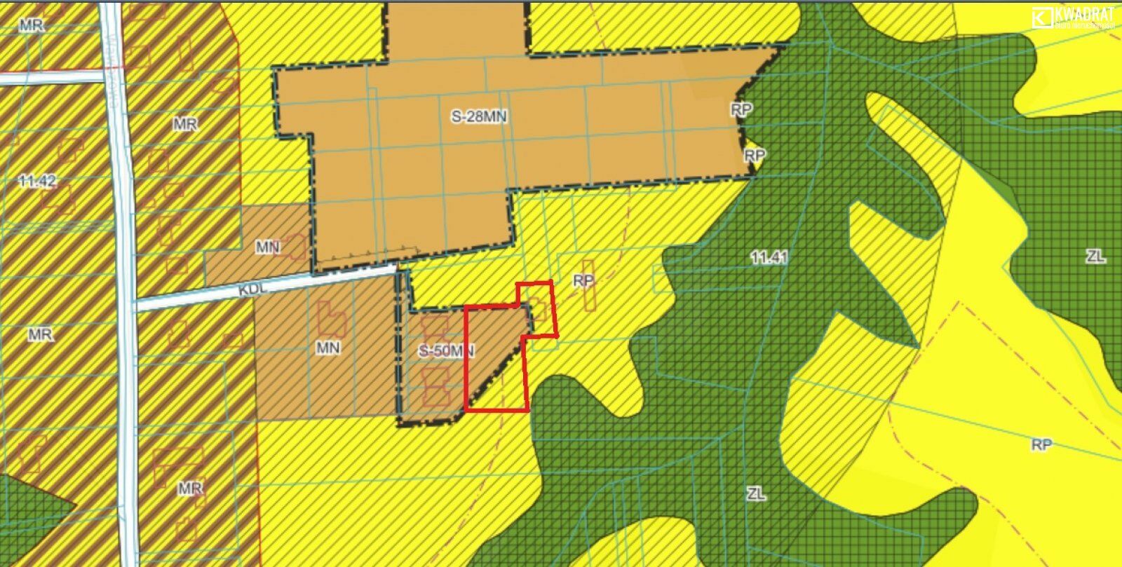 Teren objęty jest Miejscowym Planem Zagospodarowania Przestrzennego, zgodnie z którym jedna z działek (o pow. 1987 m2) w częśc oznaczona jest symbolem S-50 MN - Tereny zabudowy mieszkaniowej jednorodzinnej (ok. 14 ar) - zabudowa wolno stojąca lub bliźniacza (ustalenia z planu: wysokość zabudowy dla budynku mieszkalnego nie większa niż 12,0 m, dachy symetryczne o kącie nachylenia połaci: 0° - 45°, na działce budowlanej budynek wolno stojący garażowy lub gospodarczy, o powierzchni zabudowy nie większej niż 50 m2 i wysokości nie większej niż 6,0 m, powierzchnia zabudowy nie większa niż 40% powierzchni terenu, w równych częściach dla każdej z działek, intensywność zabudowy nie mniejsza niż 0,01 i nie większa niż 0,9).
